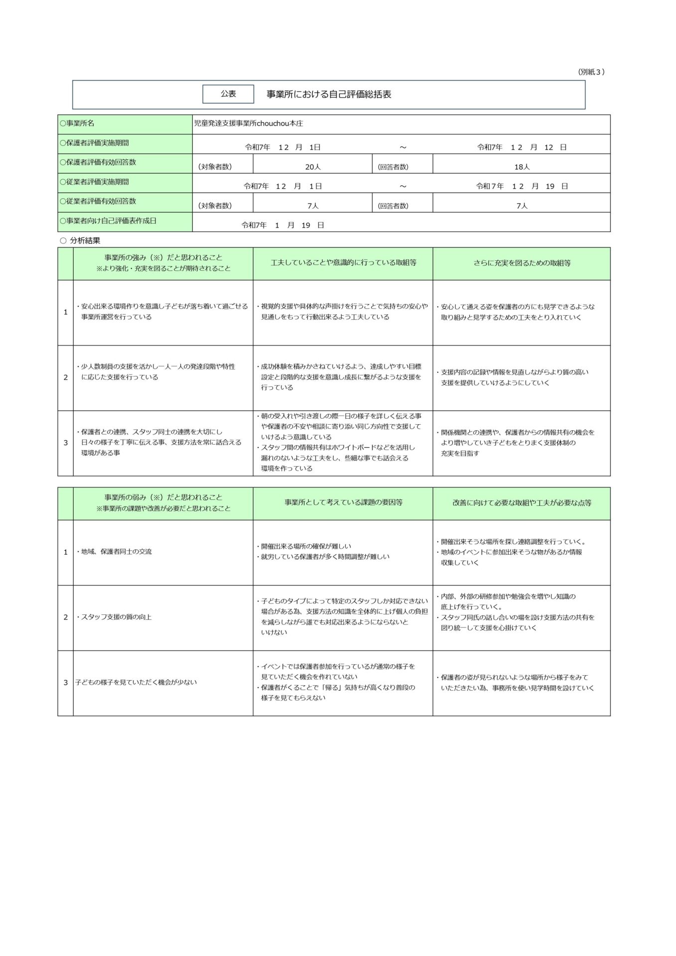 児童発達支援事業所chouchou本庄 令和7年度事業所における自己評価表結果