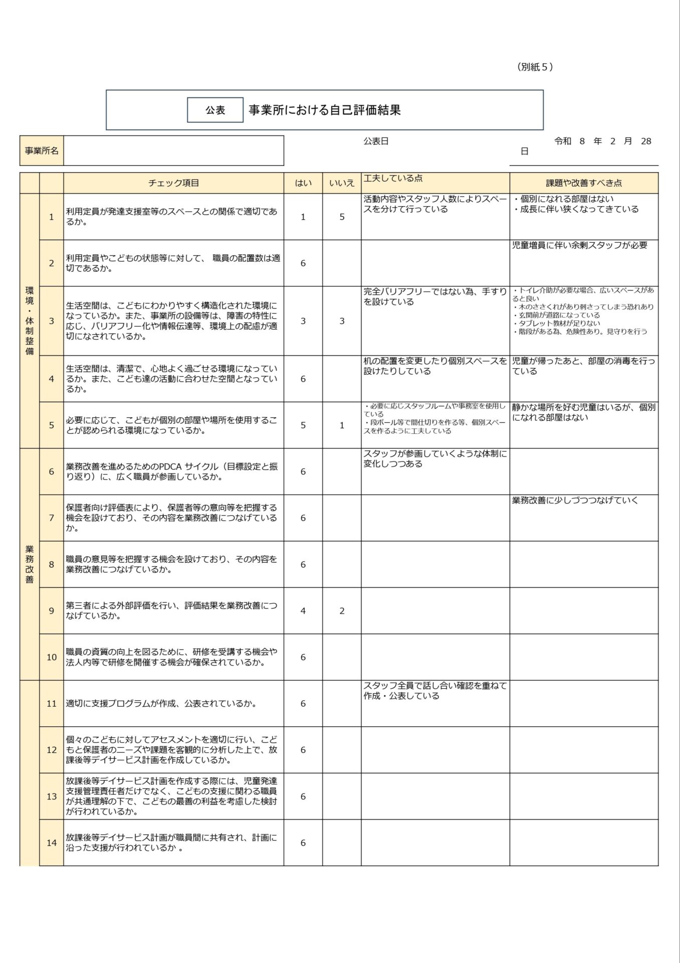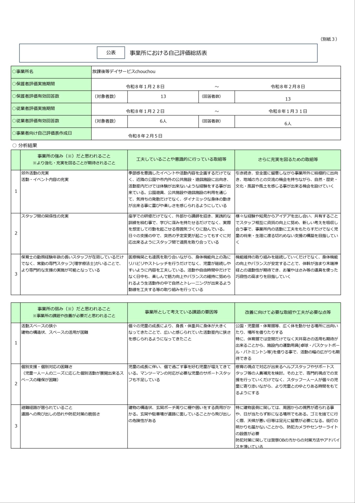 放課後等デイサービスchouchou小泉 令和7年度事業所における自己評価表結果
